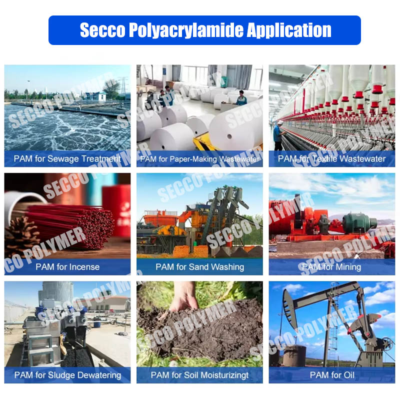Polyacrylamide อิมัลชั่นใช้กันอย่างแพร่หลายในความหลากหลายของน้ำเสียในบ้าน, น้ำเสียเคมี, น้ำเสียในสนามน้ำมัน, การลดน้ำโคลน, กระดาษและสาขาอื่น ๆ Polyacrylamide น้ำในน้ำมันอิมัลชั่นยังใช้กันอย่างแพร่หลายในการบำบัดน้ำเสียในเมือง, โรงงานเบียร์, โรงงานแป้ง, โรงงานแปรรูปอาหารและการบำบัดน้ำเสี การกําจัดของสารแข็งที่ระงับอินทรีย์ในน้ำเสียที่เป็นกรดหรือกรดมีผลบังคับใช้โดยเฉพาะ ในอุตสาหกรรมกระดาษ มันสามารถใช้เป็นกรองช่วยเก็บรักษา การบำบัดน้ำเสียในการทำกระดาษ อุตสาหกรรมน้ำมันสามารถใช้เป็นสารเคลือบอิมัลชั่นเจาะหรือสารลดไขมัน